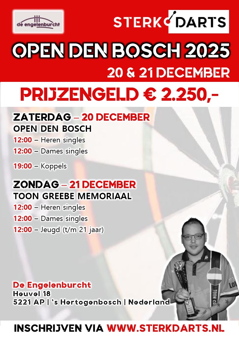 Op 20 & 21 december wordt in De Engelenburcht de tweede editie van het Open Den Bosch gehouden. Op zaterdag 20 december zijn 's middags de singletoernooien en 's avonds... Lees meer »